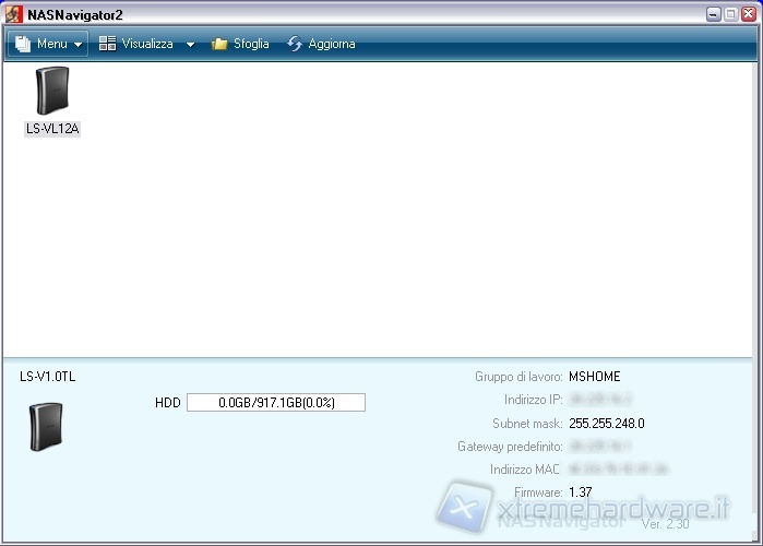 Avviamo NASNavigator2, il software di gestione che rileva automaticamente l'unità presente in rete, fornendoci informazioni quali ad esempio l'indirizzo IP.